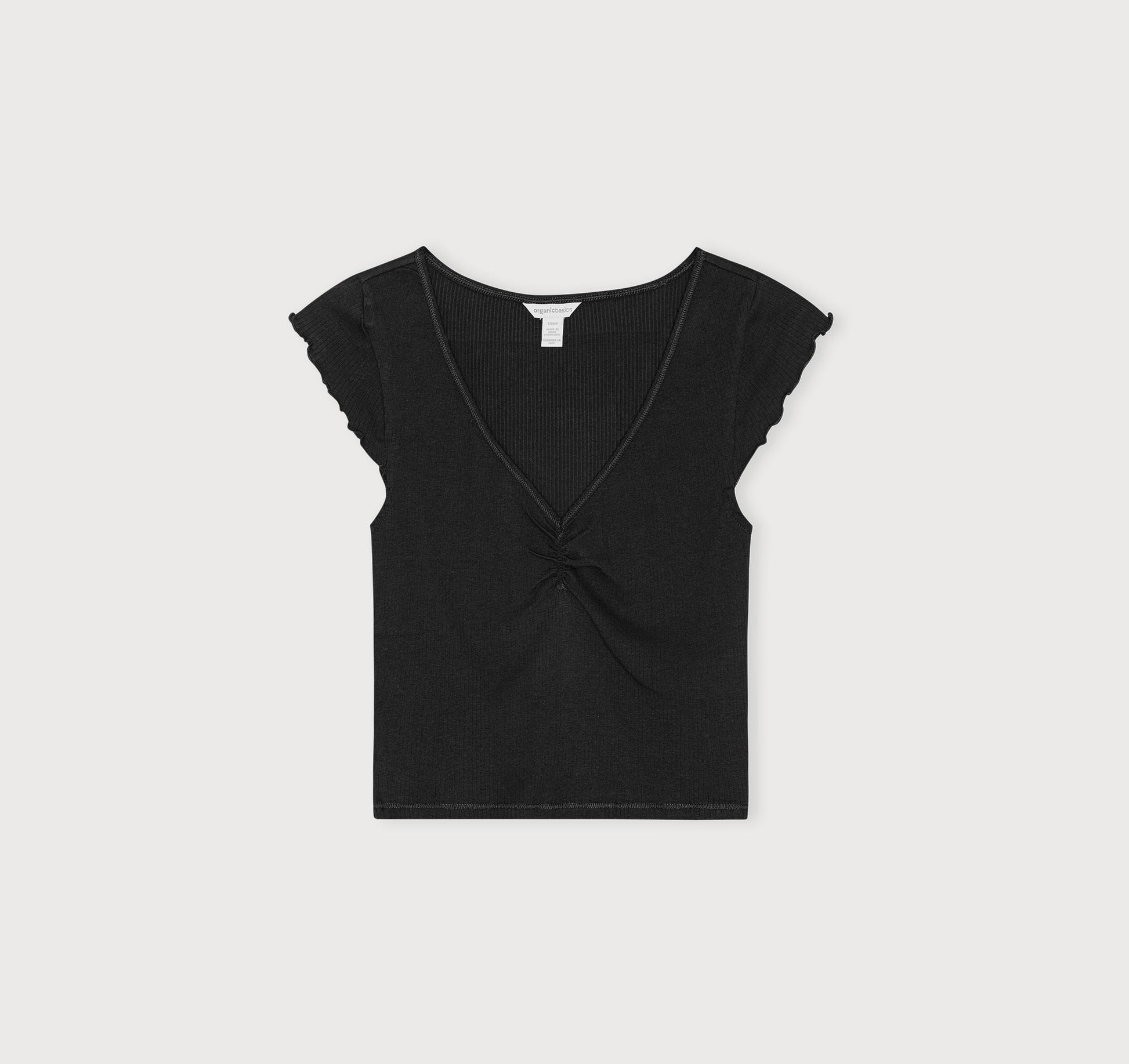 - Semi-cropped short sleeved tee that features a ruched neckline and fluttered sleeves