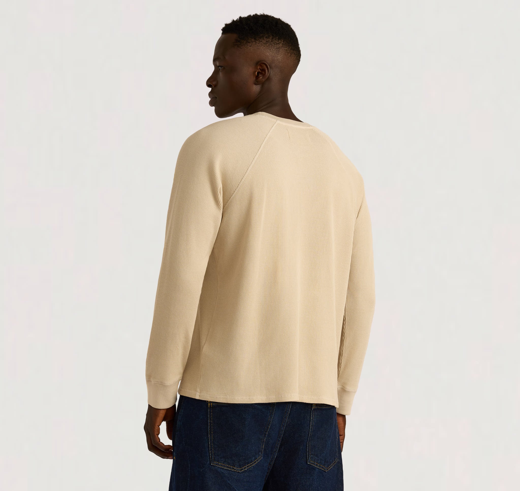 Laid-back, textured, and made to layer. This waffle-knit raglan brings easy, everyday comfort with a bit of edge.