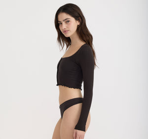 We love a cozy cardigan moment. The perfect cropped cut with long sleeves for a dreamy, effortless fit. Layer it over the Pointelle Cami or Pointelle Bralette for the softest aesthetic.